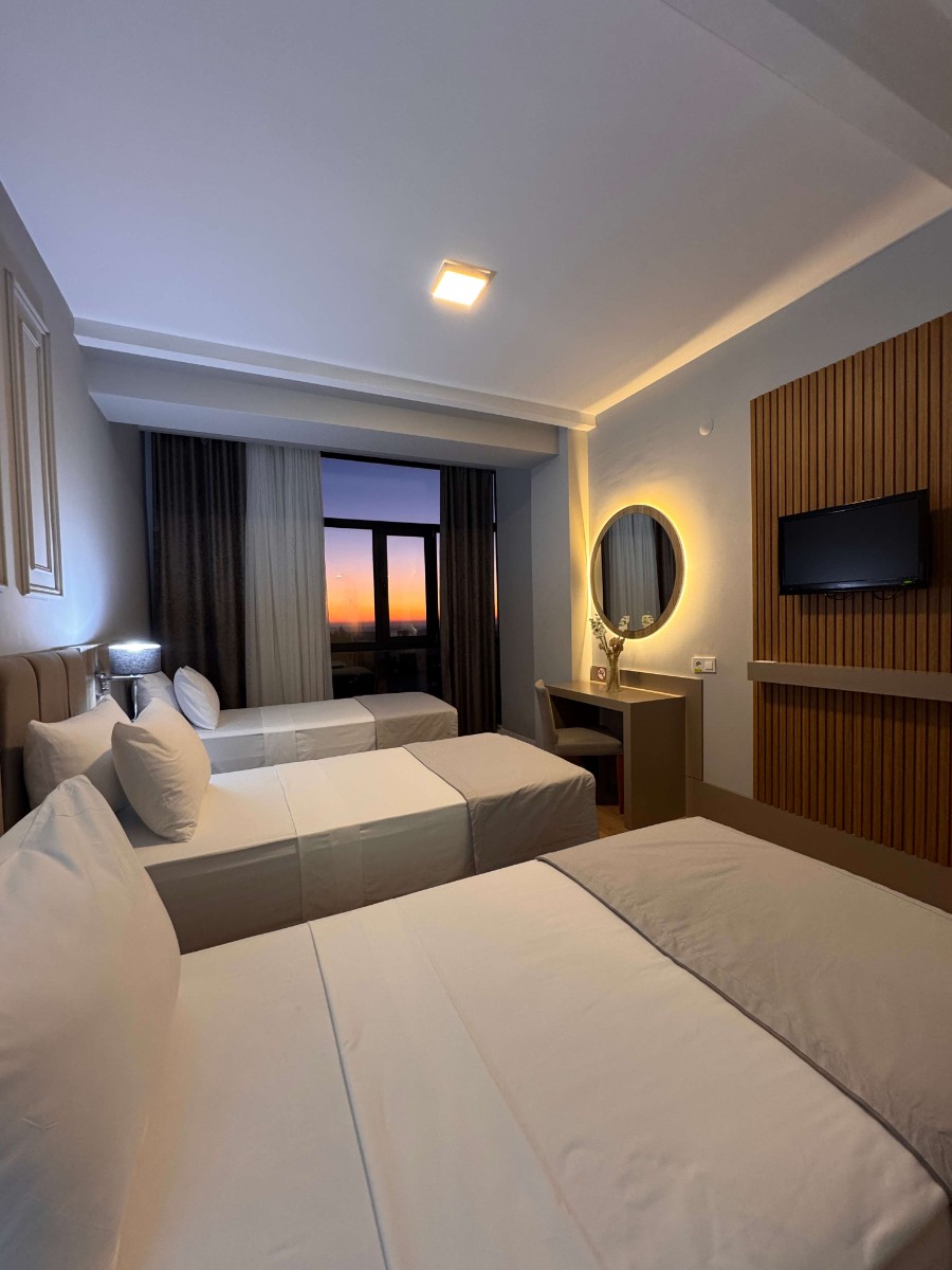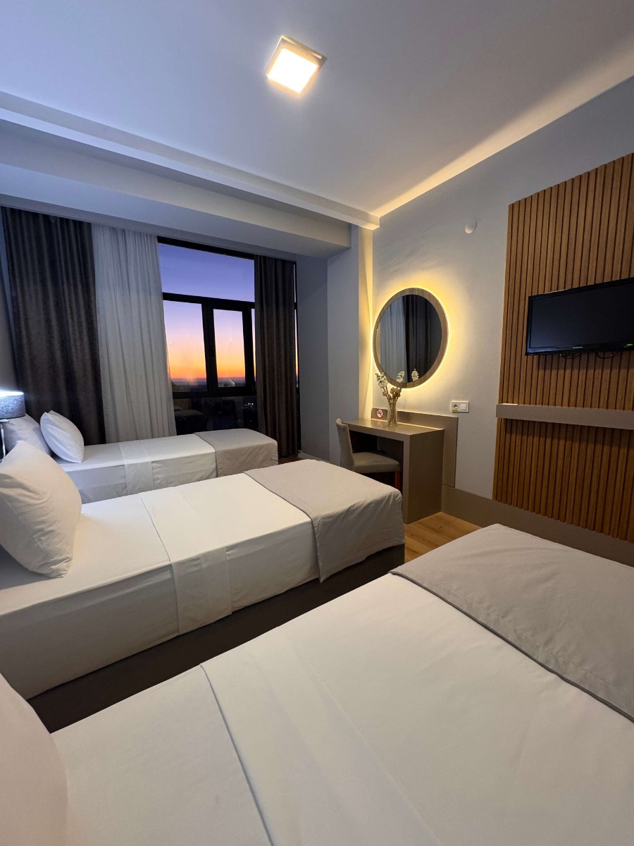Rahatlık, işlevsellik ve estetiği bir araya getiren Üç Kişilik Odalarımız, aileler ve küçük gruplar için ideal bir konaklama alanı sunar. 23 m² ile 26 m² arasında değişen geniş yaşam alanı, ferah atmosferi ve modern tasarımıyla misafirlere ev konforunda bir deneyim yaşatır. Misafirlerin tercihine göre üç ayrı yatak ya da bir king-size yatak + bir tek kişilik yatak düzeninde hazırlanan odalar, hem konfor hem de kullanım kolaylığı sağlar. -